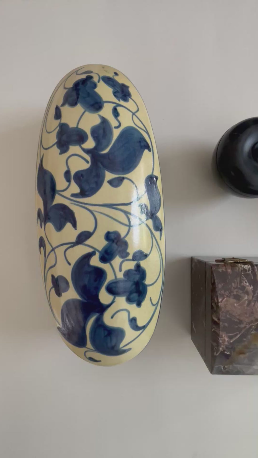 A striking oval ceramic box from Caltagirone, Sicily - a town celebrated for its centuries-old ceramic tradition. Crafted in the 1970s–80s, this piece features a monochromatic blue-on-ivory design inspired by 16th-century Spanish motifs. The interwoven foliage pattern creates a soothing, rhythmic flow, giving the box a calming presence.